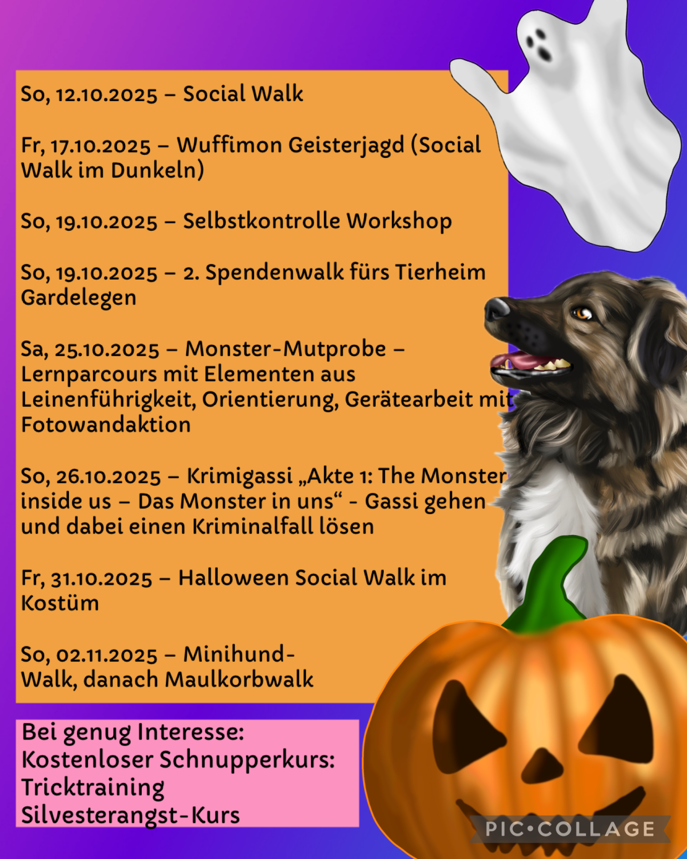 Im Oktober verwandelt sich unsere Hundeschule in einen Ort voller Schauer, Spaß und Spannung. Gemeinsam mit euren Vierbeinern seid ihr gefragt, das Böse – ob übernatürlich oder ganz real – zu vertreiben.